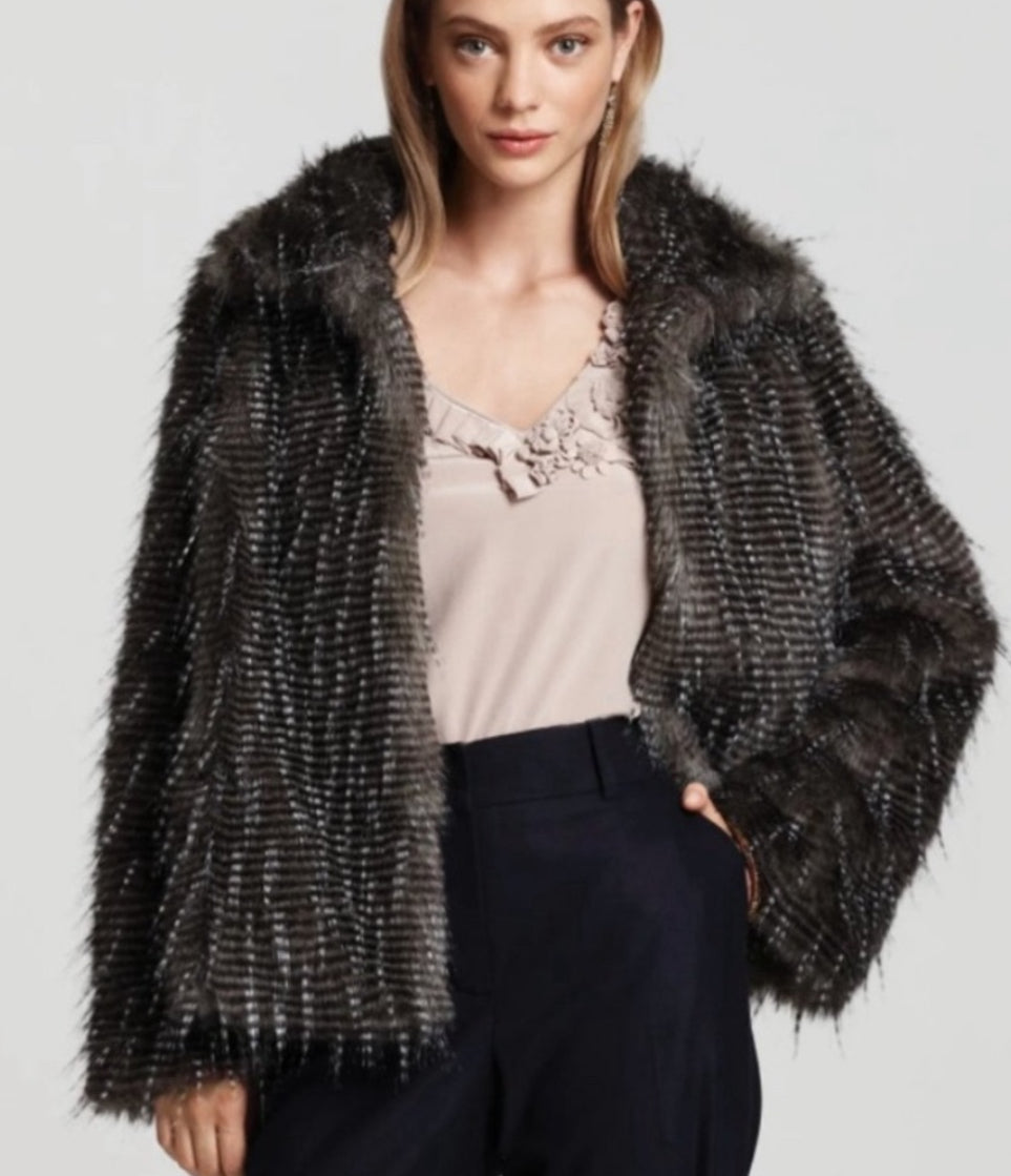 Featured Runway Stunning fluffy gray and black faux feather detailing. Raised or lowered stand-up collar. Size small